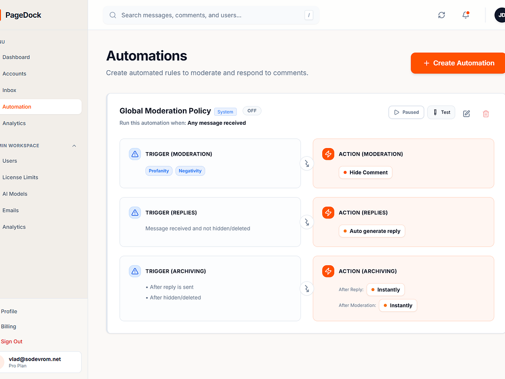 PageDock unifies messages from Facebook, Instagram, YouTube, and TikTok into a real-time inbox, automating moderation and replies using AI. You can set rules to filter out spam and hate speech, train the AI with product knowledge and brand voice, and approve drafted responses with a single click. Additionally, track sentiment, volume, and team performance through analytics, while managing multiple brands with secure API connections and role-based access.