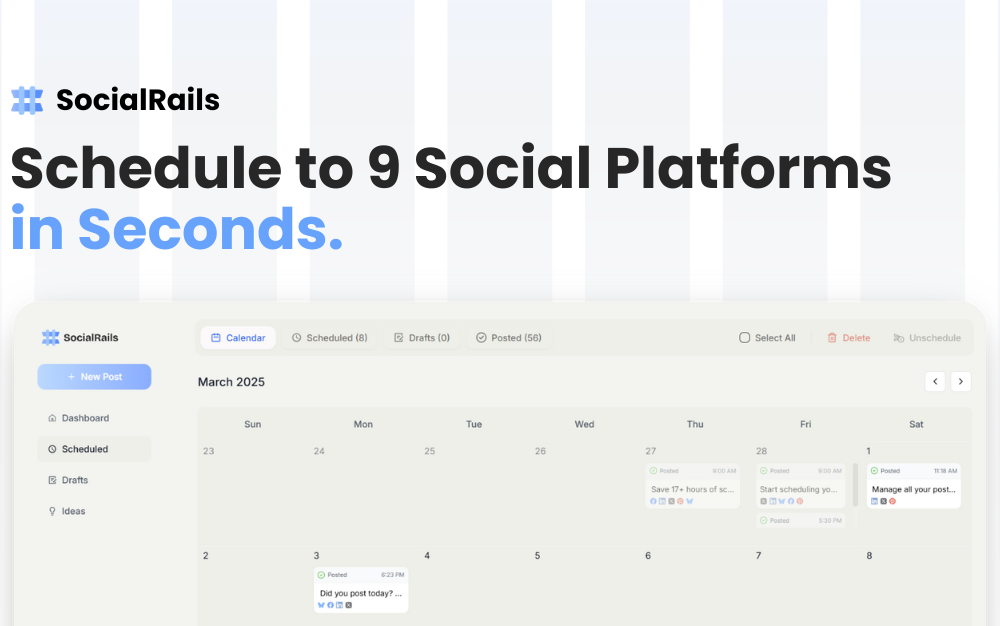 SocialRails allows you to create content and post to nine social media platforms in seconds. It stands out from other schedulers due to its user-friendly interface and mobile compatibility. With an AI assistant, you can ask questions and receive instant help. Features include generating short-form videos, GPT-5 images, and content ideas for your business. It also offers auto-recurring posts, one-click optimization for each platform, image resizing, and scheduling to various communities, including threaded posts.