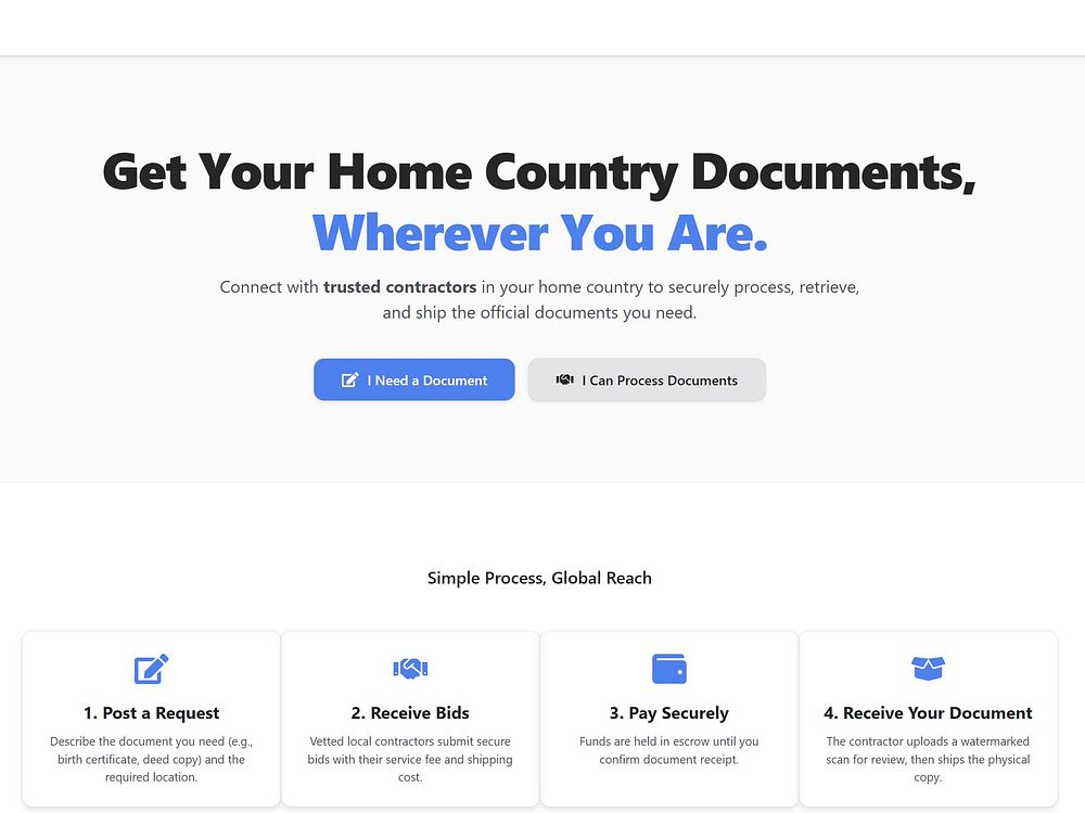 Docs by Proxy connects you with verified local contractors in your home country to securely process and retrieve official records and ship them to you worldwide. You can post a request, receive bids, and pay through escrow; funds are released only after you confirm receipt. Contractors upload a watermarked scan for review before shipping, and the platform safeguards your personal details end to end.