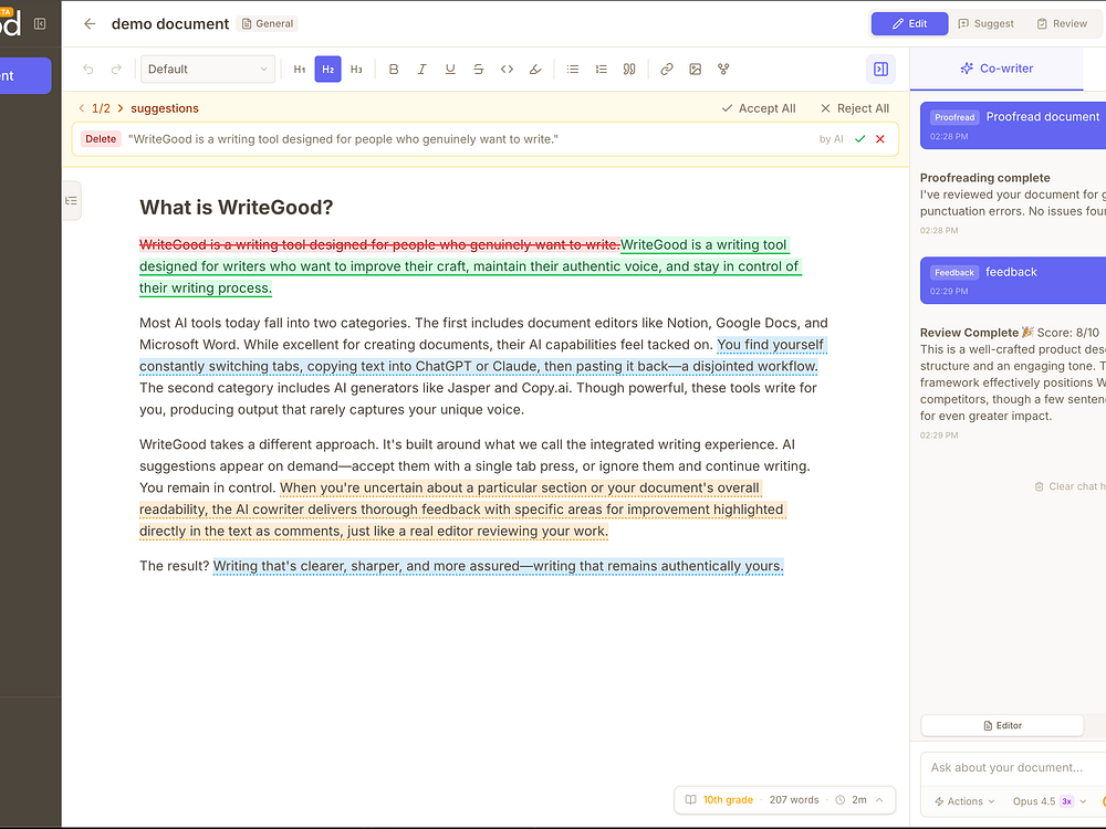 WriteGood is an AI writing partner built into your editor that delivers inline suggestions as tracked changes, helping you sharpen clarity, tone, and structure without losing your voice. It keeps you in control so you can accept, reject, or tweak every edit. It reads full-document context, supports custom style guides and templates for PRDs, RFCs, and posts, and lets you choose AI models. You can collaborate in real time, maintain a consistent voice across teams, and ship confident drafts faster.