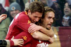 AS Roma forward Antonio Cassano (L) hugs Argentinian striker Gabriel Omar Batistuta who marked his come-back to the pitch by scoring the winning goal over Hellas Verona during their Italian Serie A first division match AS Roma vs Hellas Verona on Sunday, 13 January 2002 at Rome’s Olympic Stadium. As Roma recovered from a 0-2 first half to win 3-2 and keep the lead in the championship. EPA PHOTO ANSA/CLAUDIO ONORATI/mp/mda