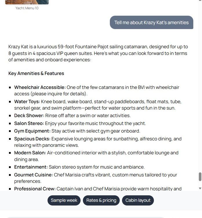 Yacht Genius AI is an AI-powered platform for planning and booking crewed yacht charters. It combines a curated, verified fleet with clear specifications, regional guidance, sample itineraries, pricing context, and smart filters, allowing you to compare yachts and routes quickly. Ask Gizmo, the built-in assistant, to refine destinations, check amenities, or outline a 7-day plan, then request quotes and availability in one step. Browse special offers and make confident decisions without juggling multiple tabs.