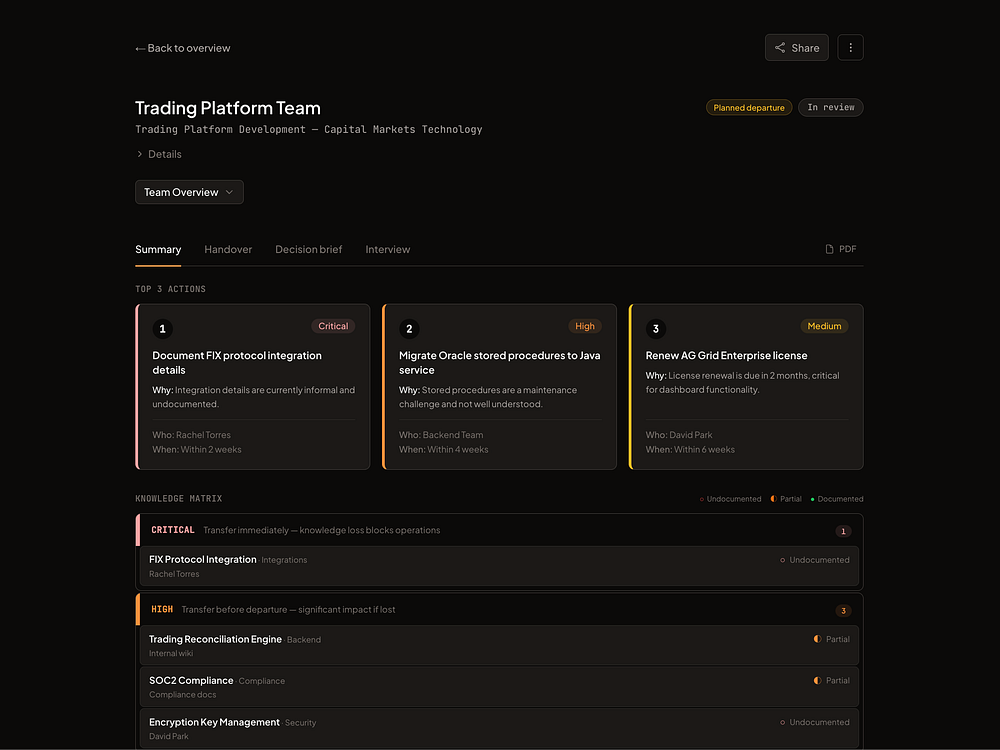 This tool helps surface undocumented systems, plan handovers, and protect continuity so your team isn't starting from zero after someone leaves.