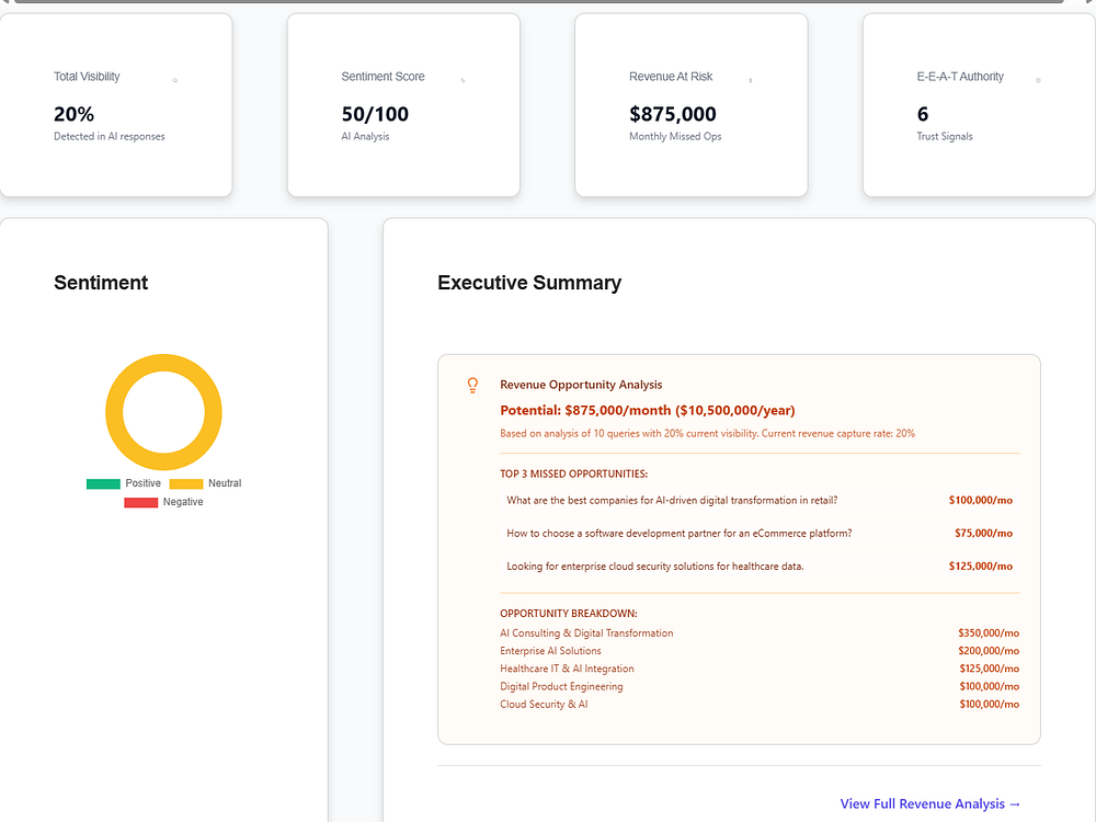 Track My Visibility monitors how your brand appears in AI-generated answers across ChatGPT, Claude, Perplexity, and Gemini. It runs prompts at scale, measures mentions, citations, position, and sentiment, and shows which pages drive visibility. You can compare against competitors, audit query coverage, and view URL-level citation paths. A dashboard displays model-wise coverage, share of voice, and AI-ready scores, while actionable recommendations help you address gaps and increase AI citations.