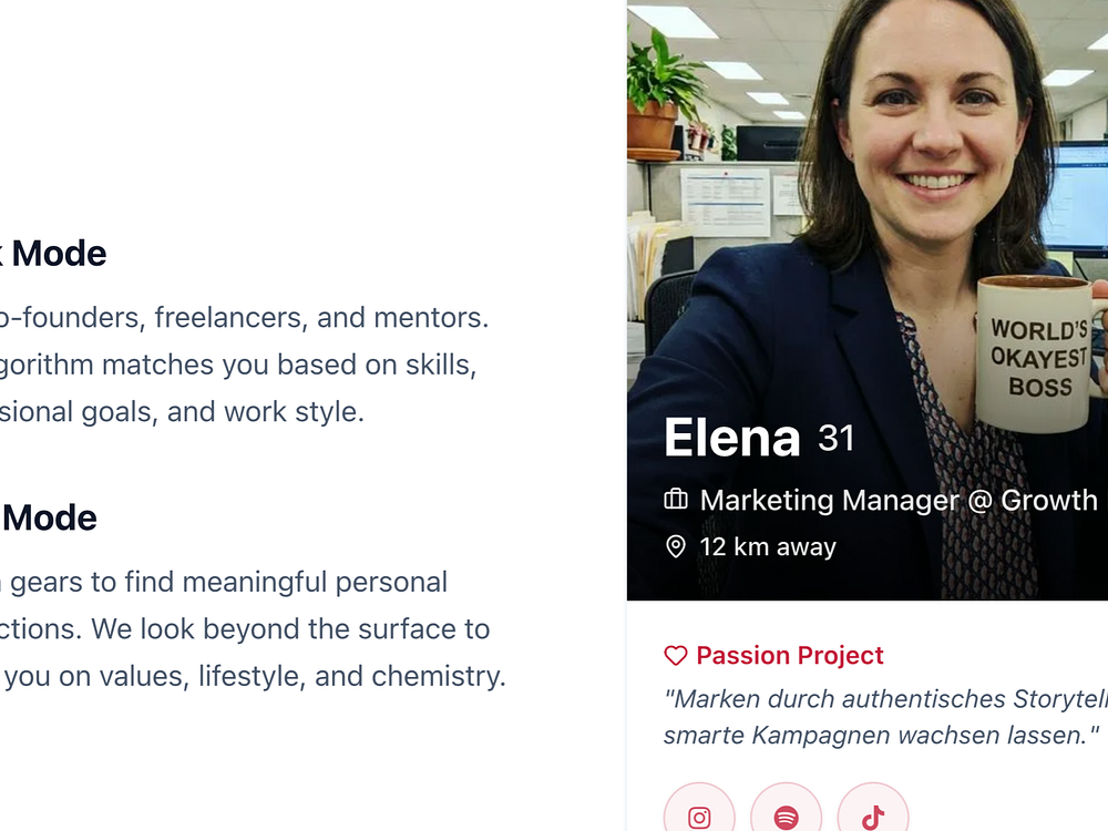 LovenWork connects ambitious professionals in two modes: Work and Love. Use Work Mode to find co-founders, freelancers, and mentors, matched by skills, goals, and work style. Switch to Love Mode to meet partners aligned on values, lifestyle, and chemistry. The algorithm pairs complementary minds, and professional verification via work email, LinkedIn, or portfolio keeps the community authentic. Toggle anytime as your intentions change and pursue both career growth and meaningful relationships.