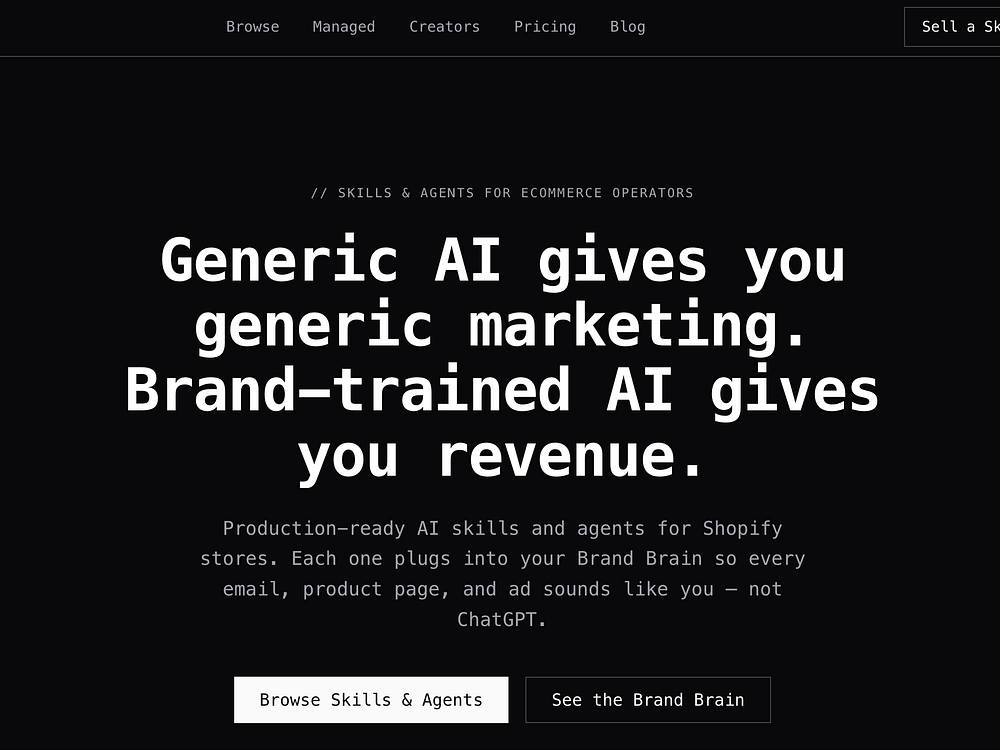 You can browse, install, and ship real work quickly, or choose managed agents for hands-off execution. Creators can list skills and sell them to DTC operators.