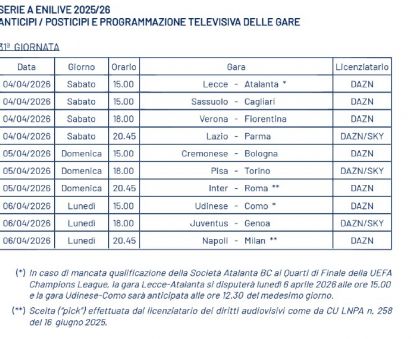 At the same time, the Udinese-Como match scheduled for April 6 at 15:00 CET will be moved to 12:30 CET, but only if Atalanta progress to the quarter-finals of the Champions League.