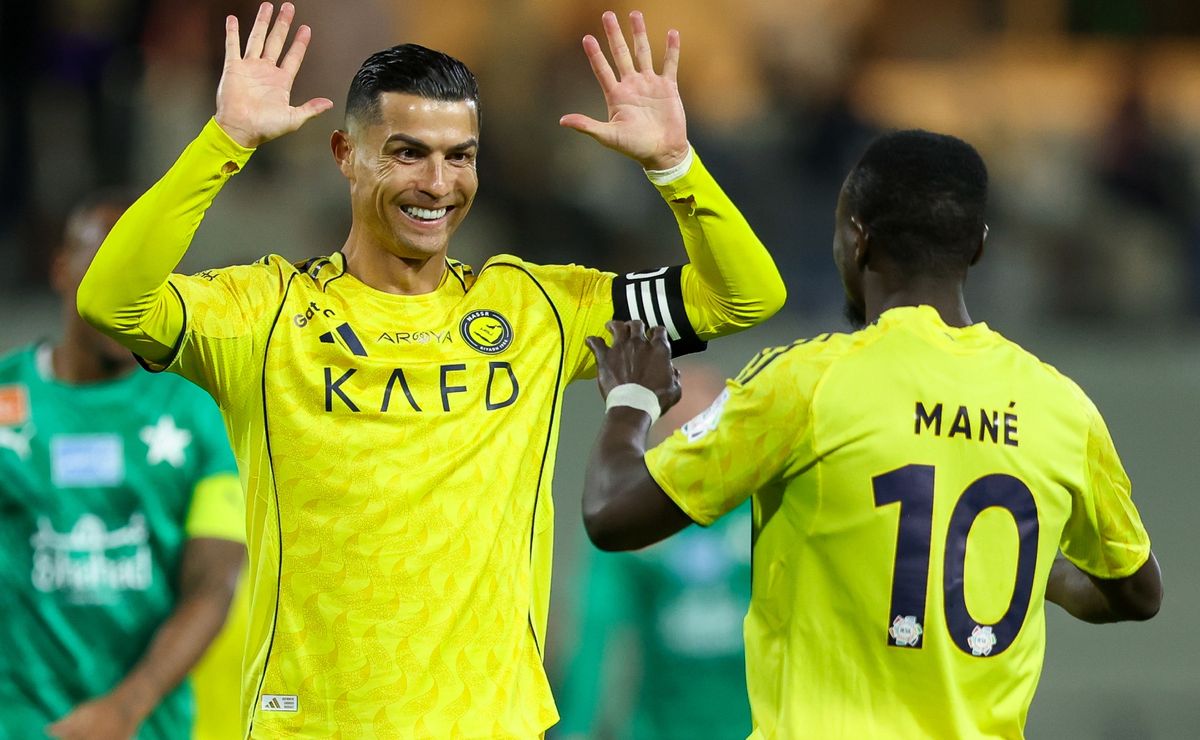 Sadio Mane of Al Nassr celebrates with teammate Cristiano Ronaldo