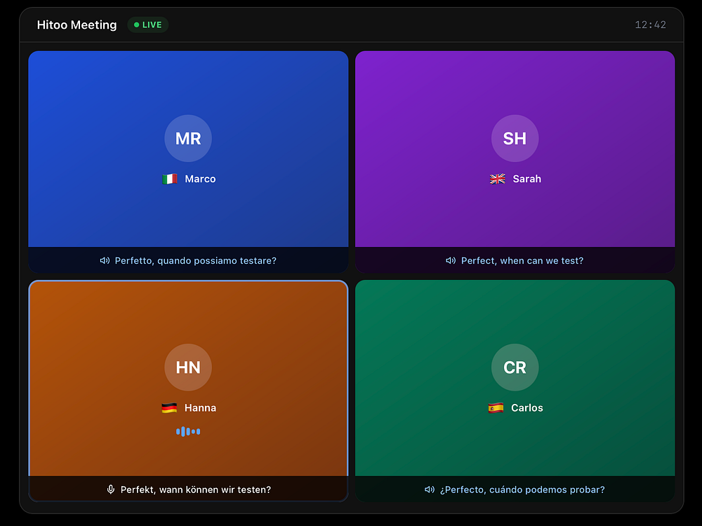 Hitoo is a live voice-translation video calling platform that lets you speak any language in real time. It preserves your voice identity with sub-300ms latency, supports over 50 languages, and delivers HD video with end-to-end encryption. Use multilingual chat with automatic translation, host group calls for up to 50 participants, and connect without plugins. Businesses use it to remove language barriers and keep conversations natural and secure.