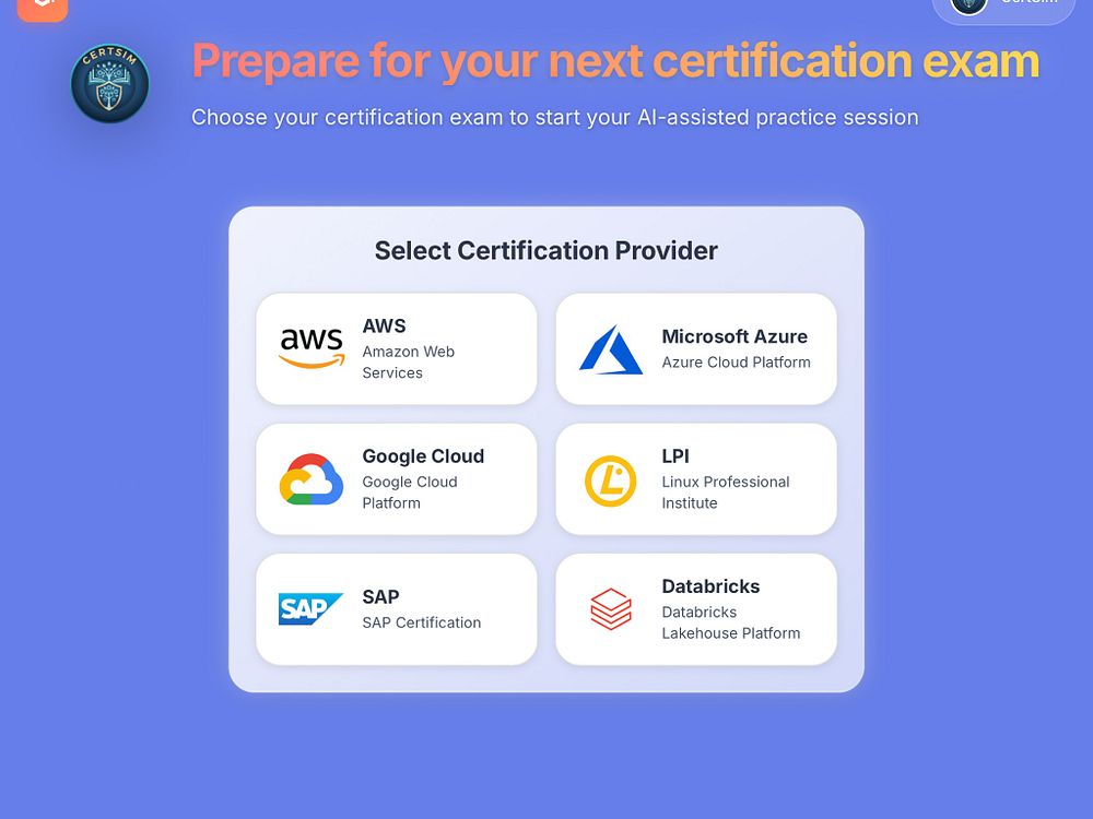 CertSim helps you pass IT certification exams with AI-driven practice tests and analytics. It delivers expert-validated questions for AWS, Azure, GCP, and more, with instant explanations, real-time translation, and timed simulations that mirror the real exam. You can track strengths and weaknesses on a dashboard, set a target date, and study on any device with continuously updated content.