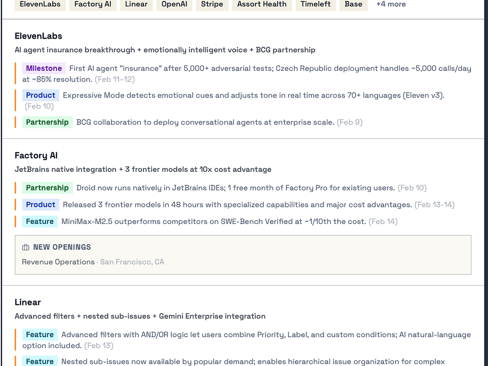 The Weekly Byte delivers a Monday email summarizing your competitors' funding, launches, hires, and partnerships, plus a web dashboard for market-wide trends and company timelines. It pulls signals from news, blogs, job boards, social channels, and product updates and synthesizes them into fast, scannable briefs. Replace the hour you spend Googling competitors every week. Pick companies to track, organize them into competitive sets, and get AI-generated landscape summaries, filters, and full profiles. Free for up to 3 companies, or upgrade to Core for $5/month for sets and AI summaries.