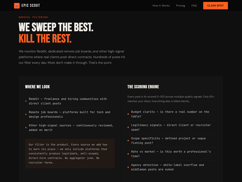 Epic Scout is a ruthless AI job filter for freelance developers and designers. Instead of losing 20% to Upwork or scrolling through irrelevant posts, our AI does the hunting. It sweeps remote job boards every two hours, eliminates junk listings, and emails you only the high-ticket, direct-client contracts that match your specific skills and hourly rate. You apply first, deal directly with the client, and keep 100% of your money.