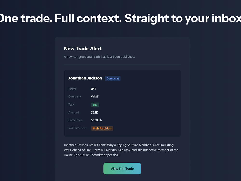 Kapitol.ai tracks, scores, and analyzes Congressional stock trades in real time, allowing you to follow high-conviction moves with clear context. It monitors all 535 members, ingests STOCK Act filings, and rates each trade by committee influence, position size, timing, and sector relevance. Subscribers receive instant email alerts, live P&L tracking, and insider score ratings, helping them turn public disclosures into actionable investment intelligence.