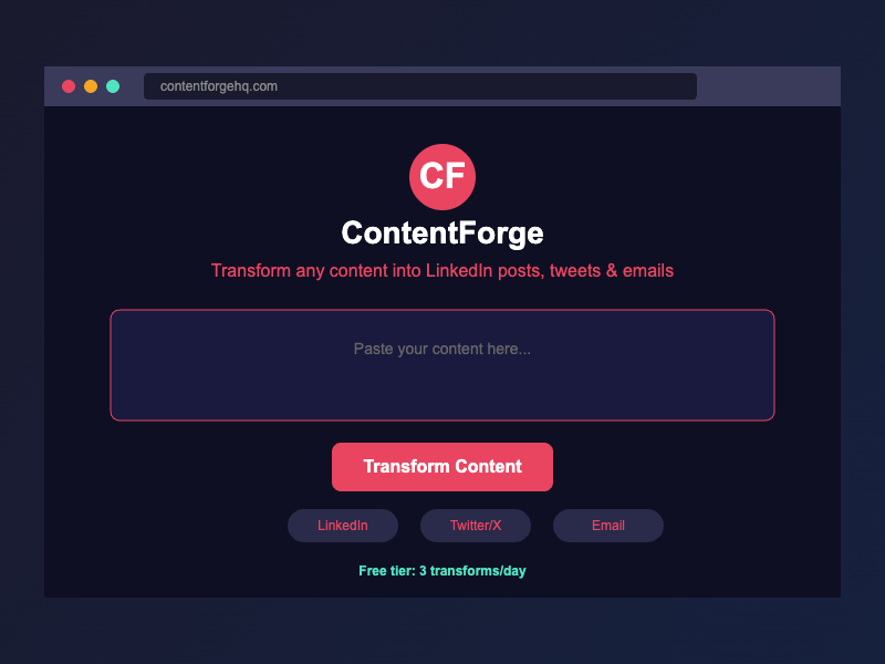 ContentForge repurposes long-form content into publish-ready posts for LinkedIn, X, email, Instagram, Threads, Facebook, ad copy, and blog outlines. Paste a blog, transcript, or notes, pick platforms, and get native tone, length, and structure in under a minute. Built for B2B creators, founders, and marketing teams, it cuts drafting time by 80%, supports tone options, and offers plans from free to business with brand voice training, bulk processing, API access, and team accounts.