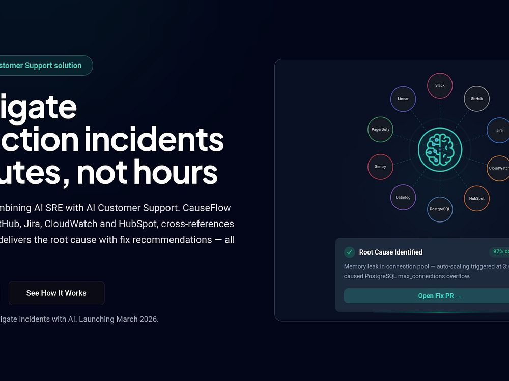 CauseFlow AI combines AI-driven SRE with AI customer support to investigate production incidents in minutes. It connects to Slack, GitHub, Jira, CloudWatch, HubSpot, and more, cross-references logs, commits, tickets, and customer context, identifies the root cause with evidence, and recommends specific fixes with human-in-the-loop approval.