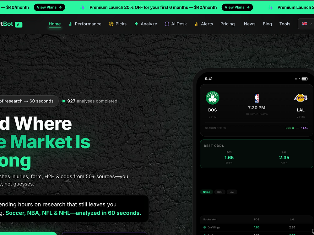 SportBot AI turns hours of pre-match research into just 60 seconds. It aggregates injuries, form, head-to-head history, and real-time odds from over 50 bookmakers to calculate win probabilities, detect edges, and flag potential risks across soccer, NBA, NFL, and NHL. You can see model versus market lines, predicted scores, risk levels, and best prices, then make your own decisions. Start free, or upgrade for unlimited analyses, AI chat, and edge alerts, with a performance dashboard tracking every prediction.