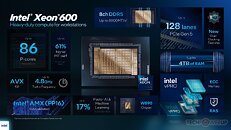 The Intel Xeon 600 series is built in the LGA4710 package, and supports Intel W890 chipset. It is configured with an 8-channel DDR5 memory interface (16 sub-channels), supporting up to 4 TB of ECC DDR5 memory, with speeds of up to DDR5-8000 being supported. The processor's PCIe root complex puts out 128 PCI-Express Gen 5 lanes. Intel is also offering CPU overclocking features with these processors. There are as many as 11 processor models, with core-counts ranging from the top 86-core/172-thread down to 12-core/24-thread, all models come with 8-channel ECC DDR5 memory and PCI-Express 5.0 x128. All processor models support Intel vPro remote manageability feature-set.