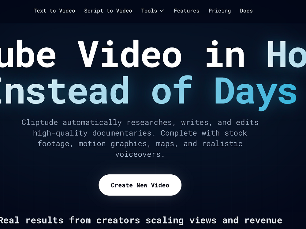 Cliptude helps creators produce documentary-style videos quickly. It researches topics, writes scripts, sources stock footage and relevant A-roll, and assembles a full edit with motion graphics, maps, and timelines. It delivers premium AI voiceovers with natural pacing and exports ready files for YouTube, TikTok, and Instagram. Start from a prompt or script, then download the final cut or separate stems while keeping full rights.