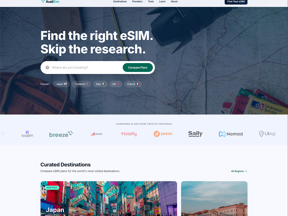 AvailSim helps travelers find the right eSIM plan worldwide by aggregating offers from trusted providers. It normalizes plan details and calculates true price per GB so you can compare coverage, data, and cost side by side, with independent rankings untouched by affiliate payouts. You also get destination guides, a data calculator, and a device compatibility checker, then purchase directly from the provider.