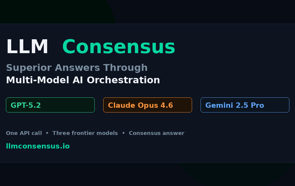 LLM Consensus sends your prompt to GPT-5.2, Claude Opus 4.6, and Gemini 2.5 Pro simultaneously. The models critique each other's responses, then combine the best elements into a single answer with a quality score from 0 to 1. This results in less hallucination and better answers for important questions. There are three modes: fast (~10s), balanced (~25s), and deep (~60s). The standard REST API is OpenAI-compatible. You can pay per request with USDC via the x402 protocol, or use API keys with prepaid credit packs and a usage dashboard.
