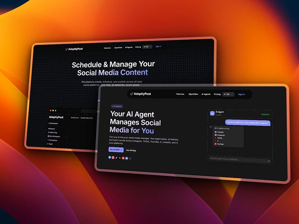 AdaptlyPost is a social media scheduling and management platform that lets you create once and publish to Instagram, TikTok, YouTube, X, and more from a single dashboard. Plan with a visual calendar, queue posts, and track what's going live. Use AI Image Studio and an AI caption co-pilot to generate visuals and copy, then automate posting via API or OpenClaw agents. Collaborate across workspaces and teams, and scale with plans for creators, businesses, and agencies.
