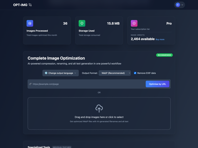 OPT-IMG is an AI-powered image SEO platform that turns raw images into SEO-ready, faster-loading assets. It automatically generates SEO-friendly filenames and alt text and compresses images in a single workflow. Users can batch process images, create responsive outputs, and export optimized assets at scale. OPT-IMG helps improve image search visibility, page speed, and Core Web Vitals for eCommerce sites, blogs, and content teams.