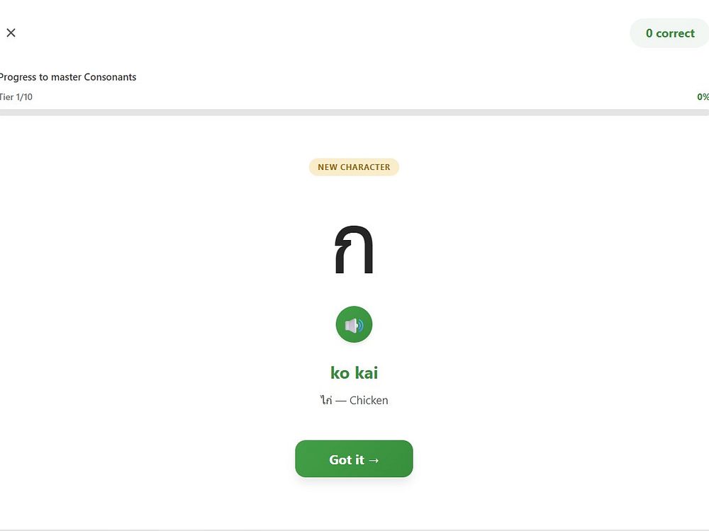 ReadThai.Fun is a free Thai script learning tool created by a 20-year Thailand expat. It uses spaced repetition and interleaving to teach all 44 consonants and 32 vowels through 19 tiers ordered by real-world frequency. Each tier requires a 100% gate test before advancing, ensuring genuine mastery. The app includes OCR camera scanning for Thai signs and menus, a 13-language translator, personal dictionary builder, 3-level writing practice, and a text decomposer that breaks Thai words into consonant and vowel components. It works on any device as a PWA and is completely free with full functionality.