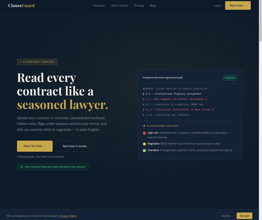 ClauseGuard analyzes contracts to reveal hidden risks, flag unfair clauses, and extract key terms in seconds. Upload a PDF, Word doc, or text file and get a report with a risk score, red flags, plain-English summaries, and ready-to-send counter-language.