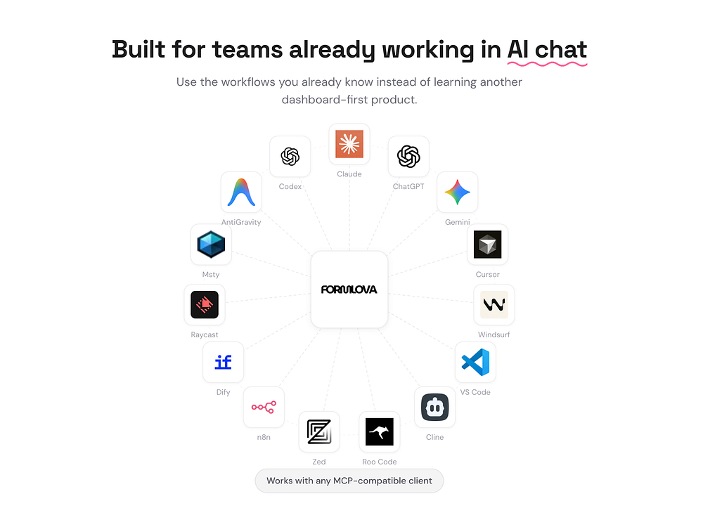 FORMLOVA is a chat-first form service powered by MCP. Create forms from ChatGPT, Claude, or Cursor in under a minute, then manage response routing, follow-up emails, reminders, analytics, and CRM handoffs from the same conversation. It integrates with 118 tools across 24 categories, focusing on the 95% of form work that happens after the form exists.
