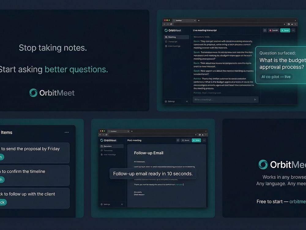 OrbitMeet is a browser-based AI meeting co-pilot that listens to your meetings in real time, surfaces questions you might miss every 75 seconds, and builds your summary as you talk with no plugins or installation.