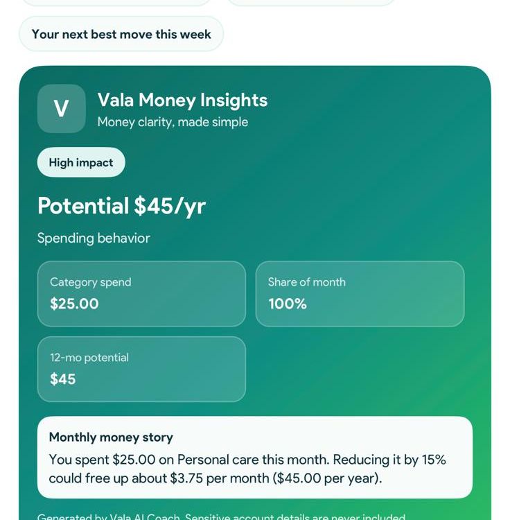 Vala also offers goal tracking, budget savings tools, and real-time alerts for bills or unusual spending. With visual insight cards and guided suggestions, it helps individuals, couples, and families understand patterns and make better decisions without manual tracking or complex budgeting.