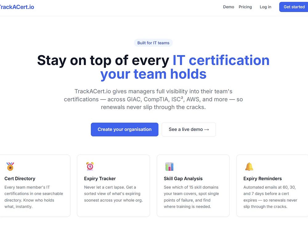 TrackACert.io is a simple tool for IT managers who need to know what certifications their team holds, what's about to expire, and where the gaps are. We connect GIAC, CompTIA, ISCΒ², AWS, Microsoft, and more in one place. Key features include IT certification tracking, certification expiry notices for your team, skill gap analysis to identify missing skills and certifications, and full reports to help justify financing for more certifications.