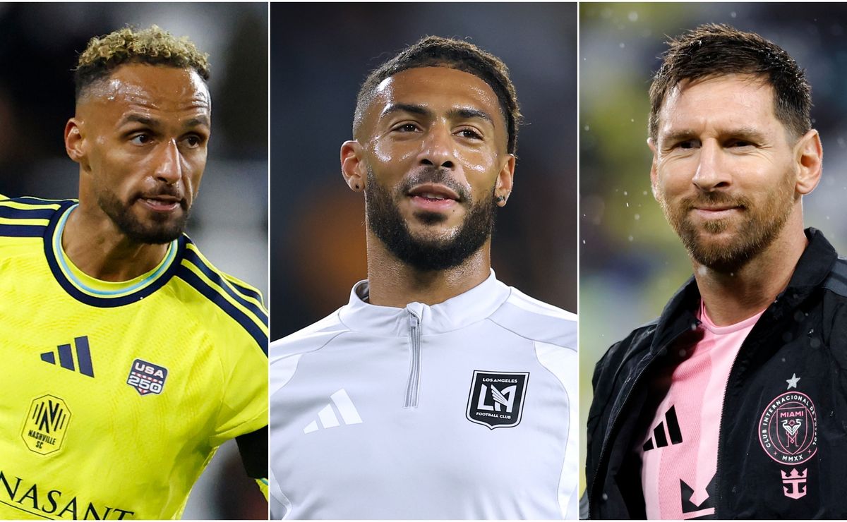Hany Mukhtar (L)of Nashville SC, Denis Bouanga (M) of the Los Angeles FC, and Lionel Messi (R) of Inter Miami CF.