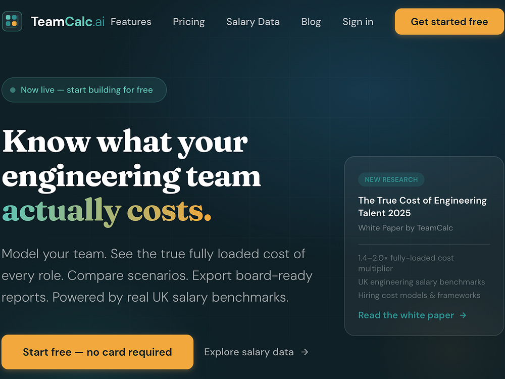 TeamCalc helps CTOs and finance leaders model engineering teams and see the true fully loaded cost of every role. It breaks down salary, employer NI, pension, benefits, equipment, office space, recruitment, and management overhead using current UK salary benchmarks. You can compare scenarios like contractor vs permanent or London vs remote, get AI recommendations to optimize structure and spend, and export board-ready PDFs and CSVs. Build headcount plans with confidence and share clear, data-backed reports.