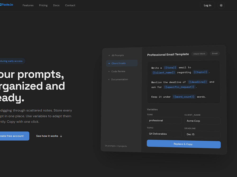 2paste.io lets you save, organize, and reuse prompts in one place. Add variables with {{variable}} syntax, fill them in fields, and copy the final text to your clipboard instantly. Group prompts with color labels and projects, search and filter fast, and track changes with automatic version history.