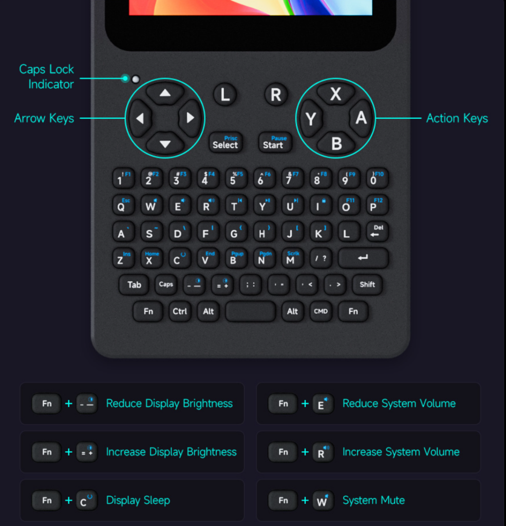 For input, the device includes a 67-key QWERTY silicone keyboard, which is intended for coding, command-line operations, and general typing tasks. It also features dedicated action keys, navigation controls, and function shortcuts for brightness and volume adjustments. An RP2040 MCU is built in to manage keyboard input and system-level controls.