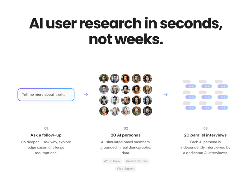 Bulker runs AI-driven qualitative research in seconds. It builds a panel of 20 AI personas based on demographic data, conducts parallel interviews, and categorizes responses with interactive charts. Each session delivers a detailed report with synthesized themes, quotes, demographic breakdowns, and fact-checked claims. You can ask follow-ups with individuals or subgroups and review the methodology and diversity metrics. A free tier is available, or you can pay about $2 per session for more usage.