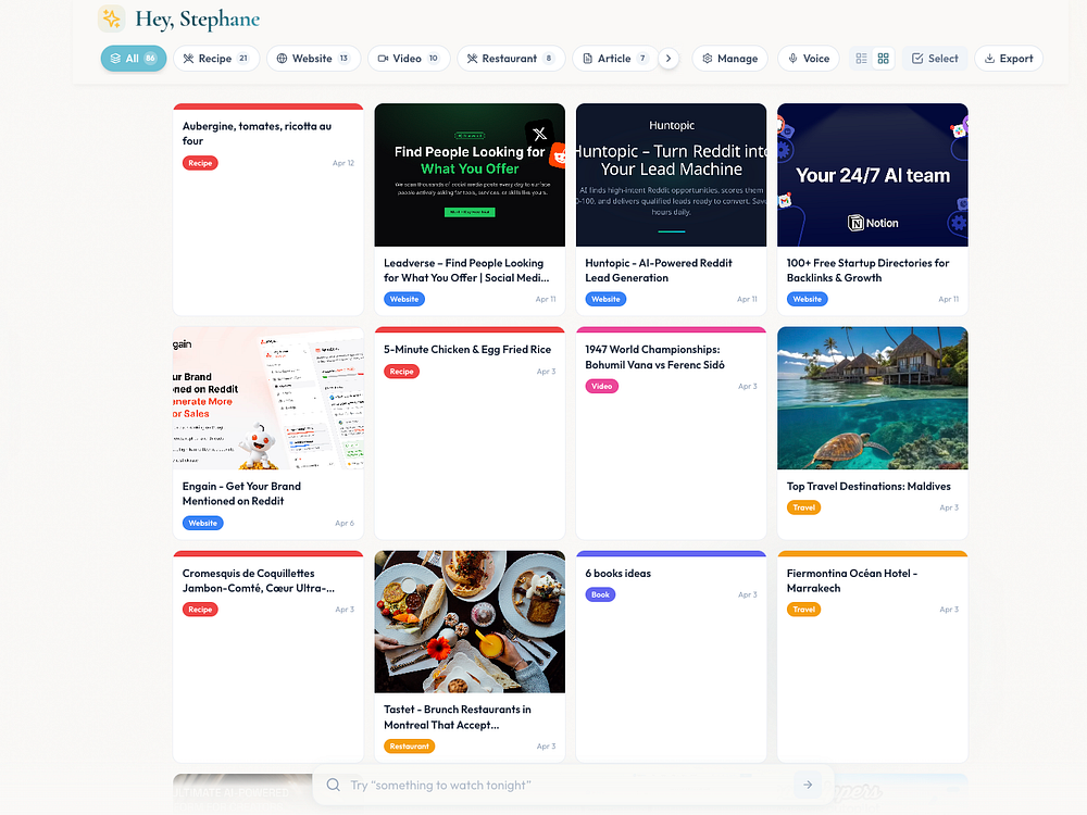 MemoKee is a central memory hub that lets you save articles, videos, social posts, product pages, notes, and voice notes from any device and find them fast. It uses AI to auto-tag and categorize your saves and semantic search to retrieve what you remember without exact keywords. Group by topic, project, or tag to build a long-term personal knowledge library you can trust.