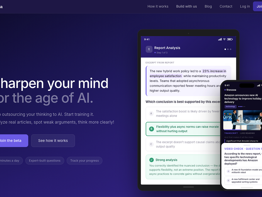 Thessea reverses that with 10-minute daily sessions built around real articles, not brain games. Read actively, answer reasoning questions, and get structured feedback that shows exactly where your thinking held up and where it broke down. A six-axis skill profile tracks your progress over time, so you can see your reasoning sharpen week by week.