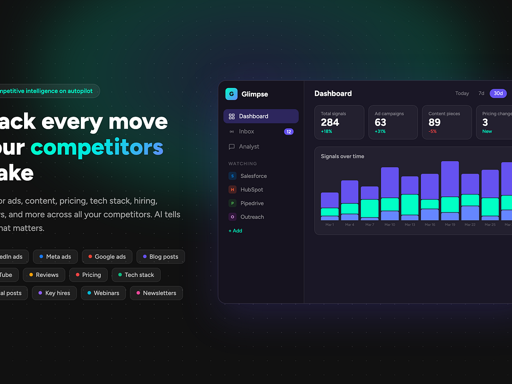 Glimpse automates competitor intelligence so you never miss a move. It tracks pricing changes, job postings, ads, blog content, reviews, social posts, website updates, and tech stack shifts, then delivers filterable signals to your inbox and Slack. AI detects patterns and strategic shifts, powers an on-demand analyst, and generates live sales battle cards. Build board-ready reports and share insights across teams without integrations or maintenance.