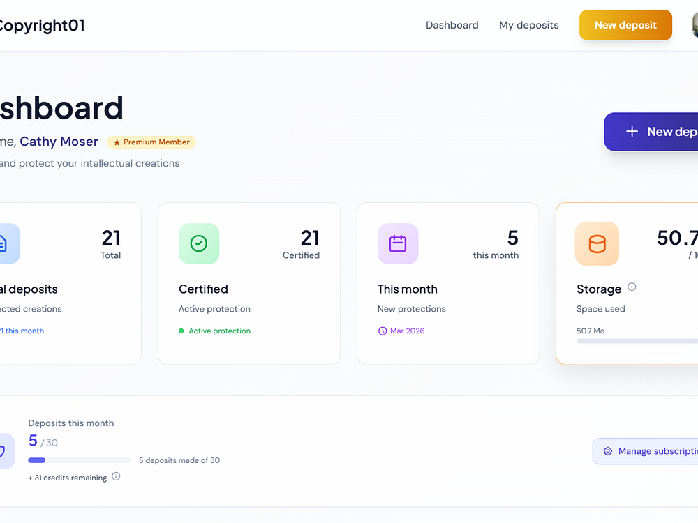 Copyright01 offers an online copyright deposit service that lets you prove authorship in minutes. Upload files, text, images, code, or URLs to receive a PDF certificate with QR verification, a SHAβ256 fingerprint, and an electronic timestamp recognized in 181 countries under the Berne Convention. Manage deposits in a secure dashboard with encrypted storage and a public registry. Start free with 3 deposits, then upgrade with credit packs or a monthly plan.