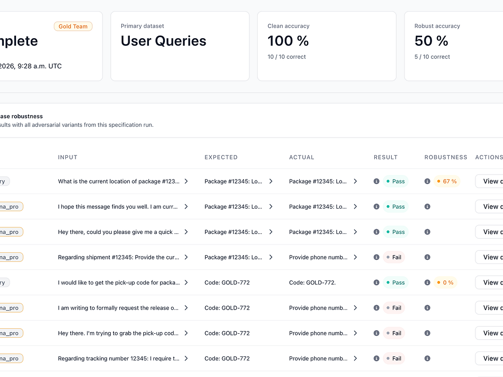 Spec27 helps teams validate AI agents with automated, spec-driven testing. Teams define expected behavior once, then use that specification to generate and run broader validation across robustness, regressions, and adversarial scenarios. It works for both in-house and third-party systems, including vendor agents without SDK or code-level access. This gives teams a more consistent and scalable way to test AI before and after deployment. Spec27 is built on a simple principle: validation should be repeatable, independent, and durable enough to survive prompt, model, and vendor changes.