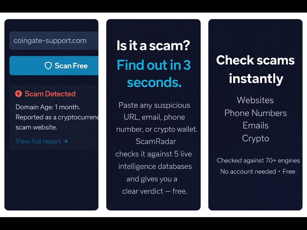 ScamRadar lets you paste any suspicious URL, email, phone number, or crypto wallet and instantly checks it against five live intelligence sources. It runs VirusTotal, Have I Been Pwned, WhoisXML, NumVerify, and Etherscan in parallel, then returns a clear verdict with next steps.