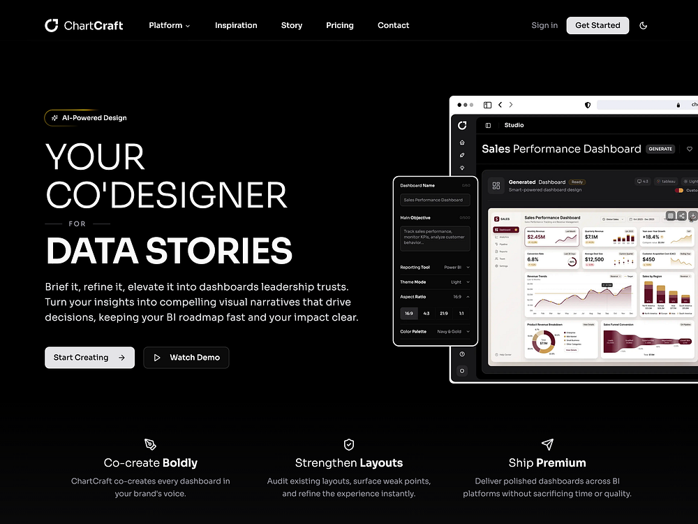 ChartCraft is an AI-powered dashboard design studio that helps turn data into clear, effective visuals. It generates chart choices, intelligent layouts, and consistent styles so you can quickly move from idea to a polished dashboard. Use it to prototype analytics pages, iterate with stakeholders, and hand off precise specs to build teams.