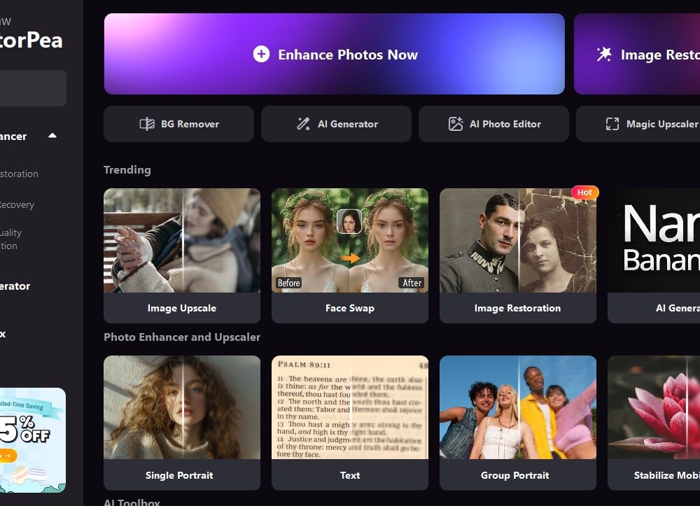 HitPaw FotorPea uses advanced AI models to enhance images from start to finish. It can sharpen, unblur, denoise, recolor, and upscale images up to 4K+ while preserving natural details. It also includes an AI image generator that creates high-quality visuals from text prompts in seconds. Restore faces, fix motion blur, remove backgrounds, and repair old or low-light photos using dedicated models for Face, Sharpen, Denoise, Low-light, Colorize, and Upscale. Available on Windows, Mac, online, and mobile, it integrates smoothly into your workflow for one-click, pro-grade results.