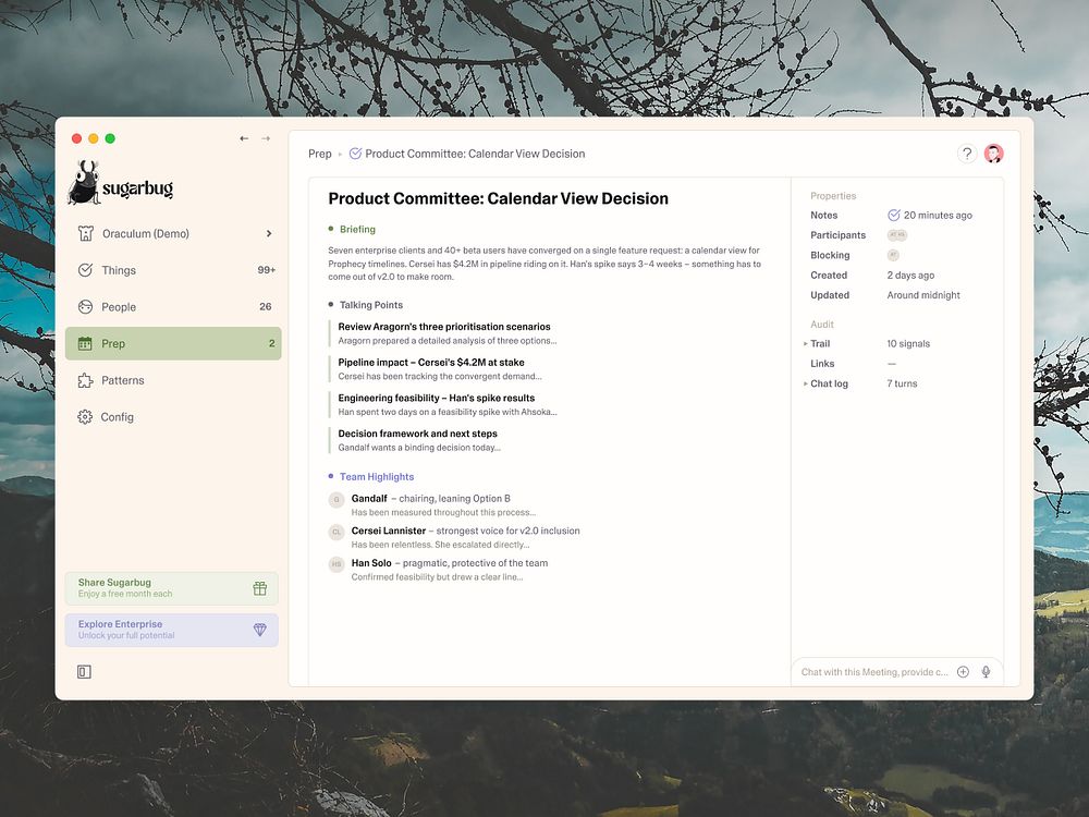 Sugarbug is workflow intelligence that connects your tools, collects every signal, and builds a living knowledge graph to provide ready-to-use insights. It auto-links tasks, people, and activity across Linear, GitHub, Figma, Slack, Notion, email, and calendars, then creates briefs, status updates, and summaries so you can show up prepared. With compounding context and living profiles, it offers full visibility into work and relationships without manual effort.
