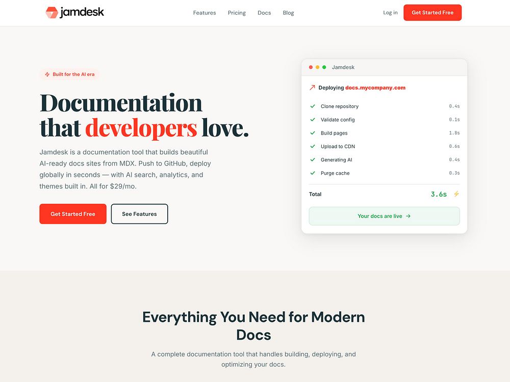 Jamdesk is a documentation platform that turns MDX into beautiful, AI-ready doc sites and deploys them globally in seconds. Push to GitHub and it auto-builds, serves via CDN, and adds SSL and custom domains. It includes AI chat search, analytics, professional themes, and 25+ MDX components like callouts, tabs, and code blocks. It generates llms.txt for LLM indexing and supports agent-driven edits and CLI-controlled pipelines for a flat monthly price.