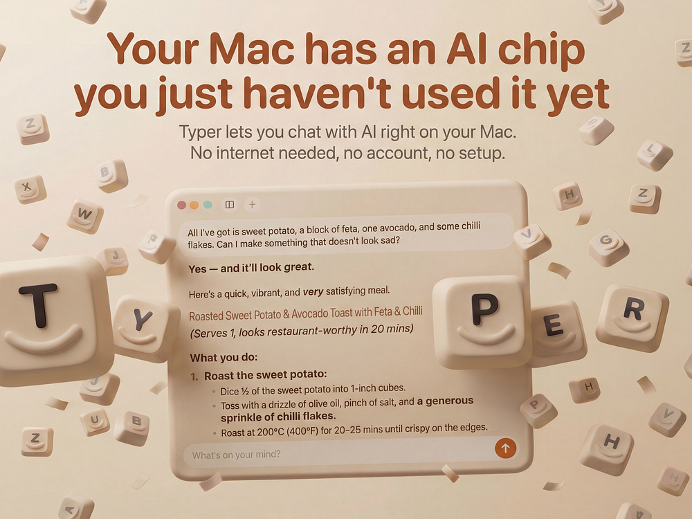 Typer is a chat app for Mac that runs AI models locally on Apple silicon. It requires no account or internet, keeps chats on your device, and remains ad-free. It can search the web when needed, see images you drop in, and automatically selects models optimized for your Mac. The core app is free, with Hyper Typer offering unlimited web searches via a one-time purchase or subscription.