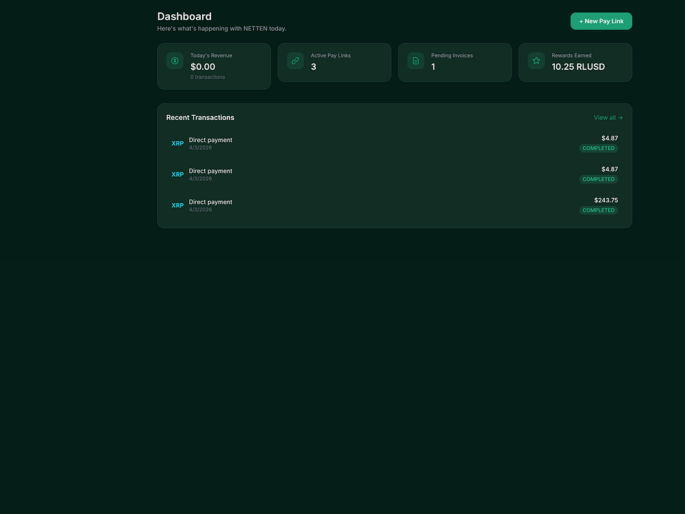 NETTEN lets merchants accept crypto from any client worldwide and settle in seconds to RLUSD on the XRP Ledger. It is non-custodial, so funds go straight to your XRPL wallet with a 1% flat fee. Create shareable pay links, let clients pay in BTC, ETH, SOL, XRP, or by card via MoonPay, and receive RLUSD instantly with no holds. The built-in Net Ten rewards deposit RLUSD to your wallet every 10 confirmed payments, and you can withdraw to your bank via MoonPay. Plans add invoicing, analytics, API access, and team seats.