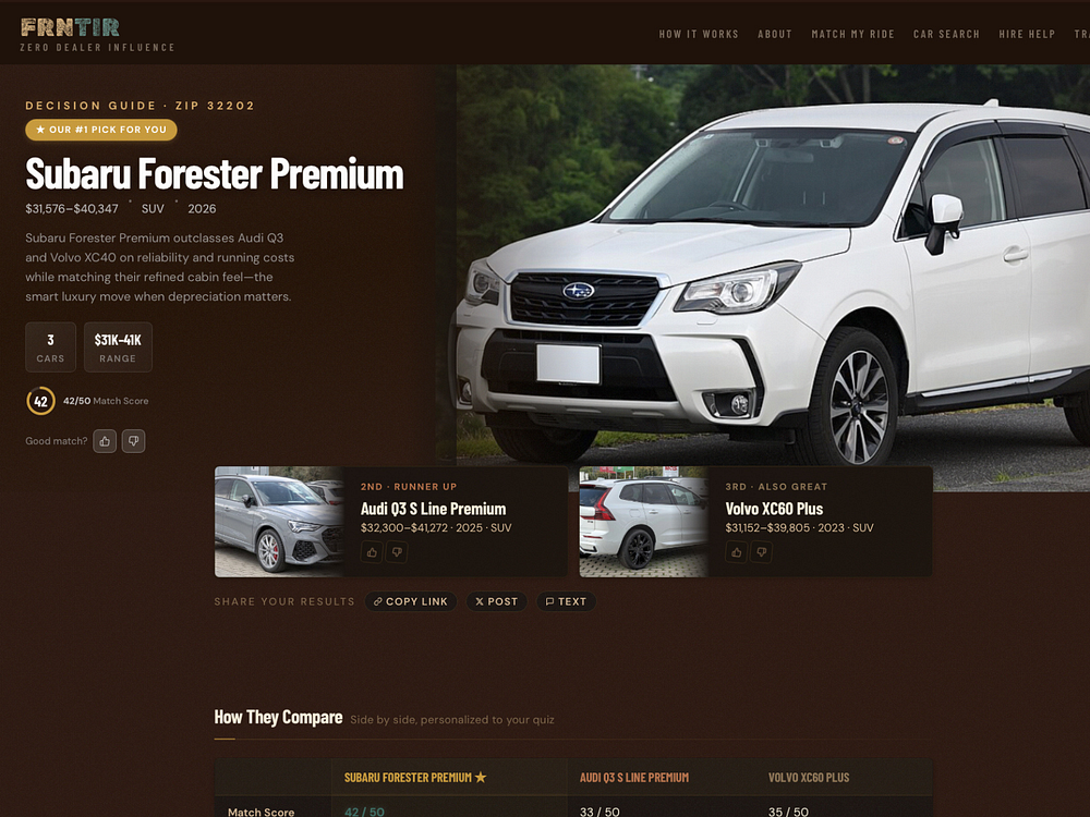 FRNTIR is buyer-funded car pricing intelligence with zero dealer money or kickbacks. You get independent market data, leverage points, and a negotiation playbook so you know what to pay and when to walk.